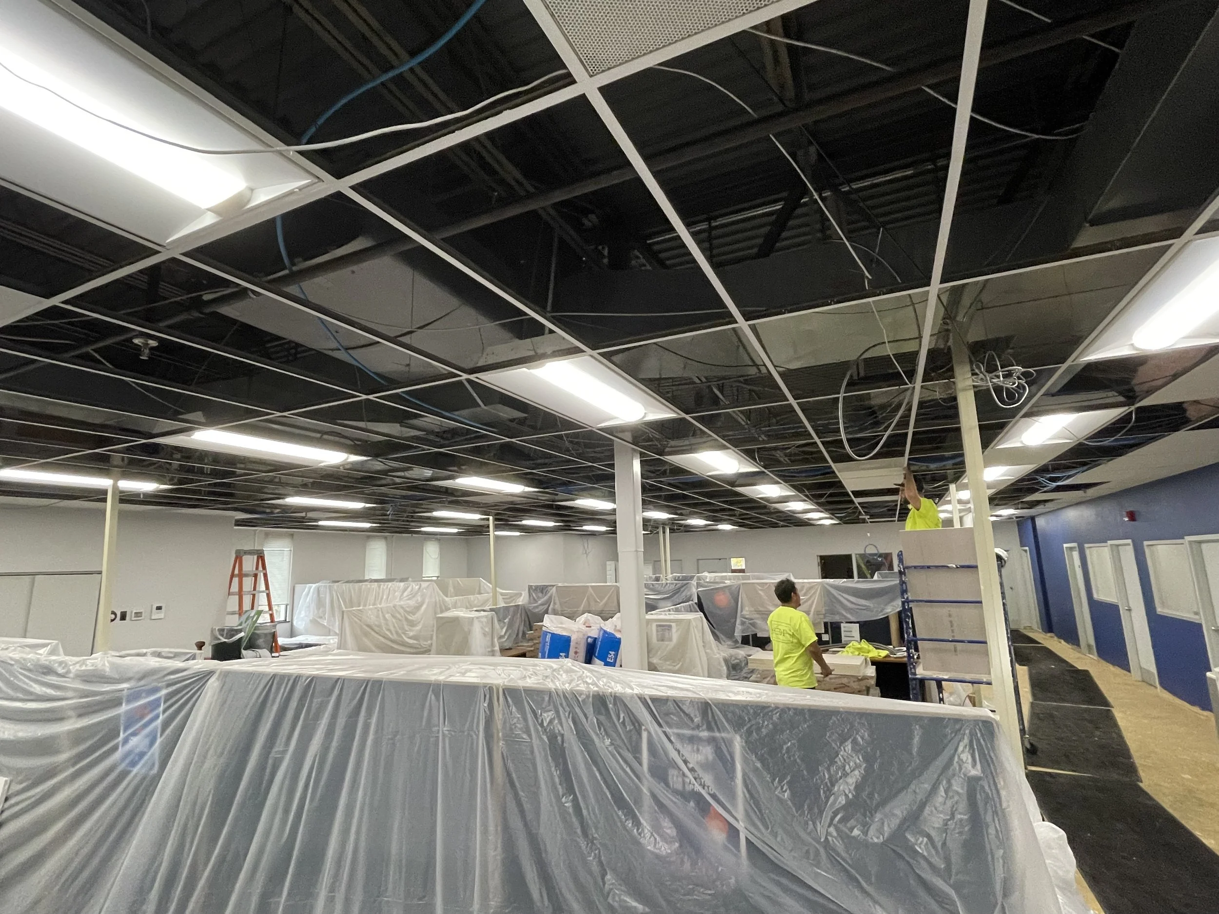 Crazy water damage. We had to replace about 2000 sf of carpet tiles and break down / set up dozens of cubicles. Paint, base, ceiling tiles, drywall, etc.